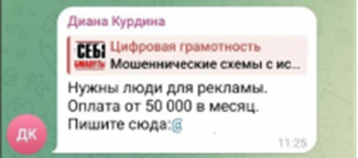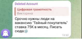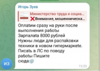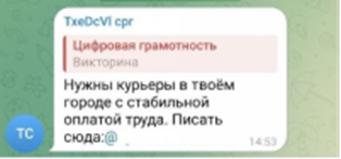 Напрямую мошенники в интернете не могут размещать объявления о поиске таких лиц, поэтому свой интерес они прикрывают предложением различного другого заработка, не вызывающего подозрения. Например, в Telegram рассылают объявления о поиске курьеров в любом городе со стабильной оплатой труда, грузчиков, людей на вакансию «тайный покупатель», заманивают обещанием высокой и быстрой оплаты.