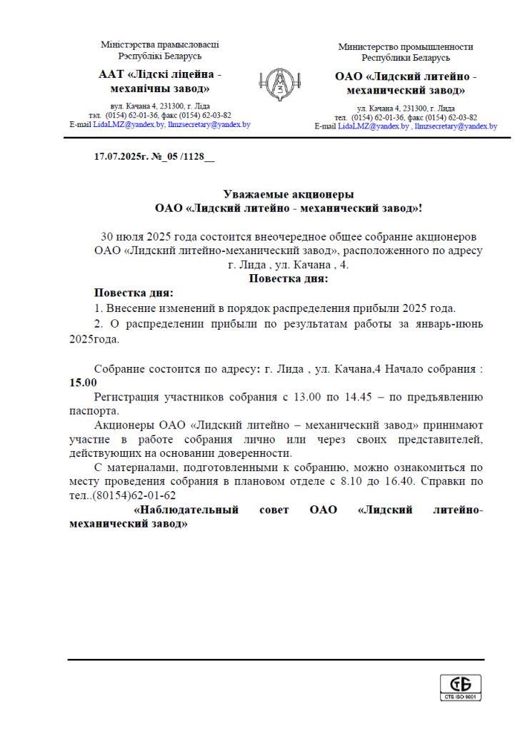 Уважаемые акционеры ОАО «Лидский литейно - механический завод»!