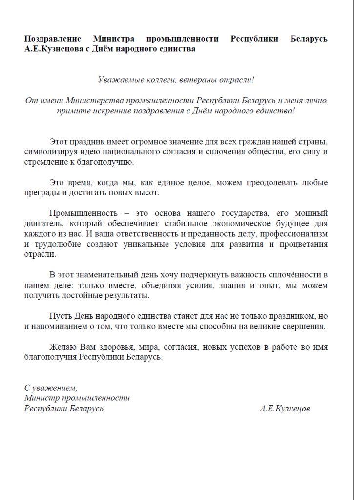 Поздравление Министра промышленности Республики Беларусь А.Е.Кузнецова с Днём народного единства