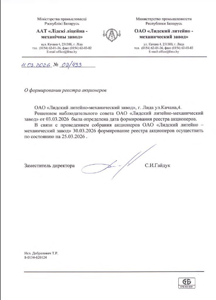 Решением наблюдательного совета ОАО «Лидский литейно-механический завод» от 03.03.2026 была определена дата формирования реестра акционеров.